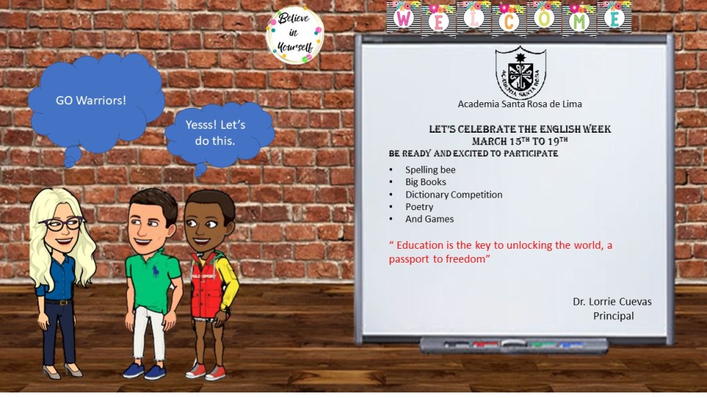 English Week Posted byydejesusasrMarch 12, 2021Posted inUncategorized Share this: Share on X (Opens in new window) X Share on Facebook (Opens in new window) Facebook Like Loading... Related Published by ydejesusasr Hi I am an experienced teacher for 17 years, bachelor's in elementary. Working on my Master's Degree as an ESL teacher. View more posts
